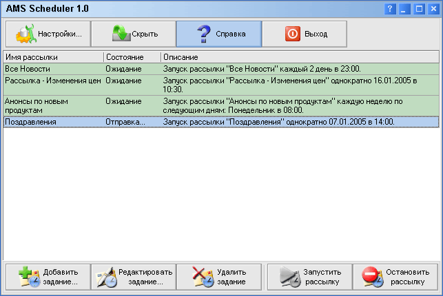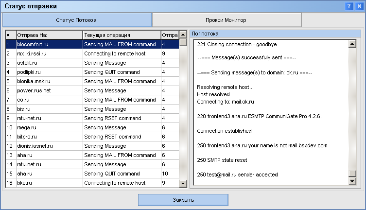 В процессе рассылки Вы можете наблюдать за ходом рассыли и анализировать логи работы программы.